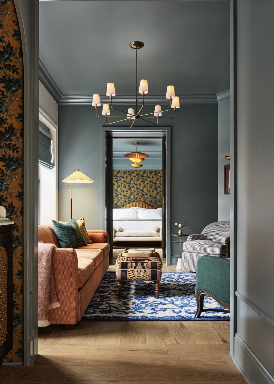 Evoking the warmth of cozy European-style hotels, the interiors display layered storytelling, rich textures, and a palette of bold, character-rich colors that pay homage to the building's history while embracing a fresh perspective.