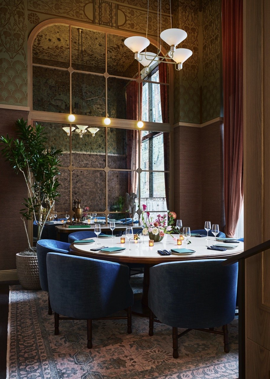 The Snug Room located off the bar is adorned in a hand-paint mural of various size flowers conjuring a lush garden of chinoiserie flowers. Similar floral patterns are referenced throughout hotel.